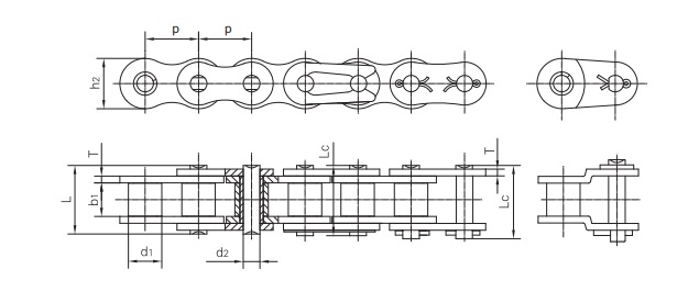 | Шаг цепи p мм | Диаметр ролика d1 мм | Ширина между внутренними пластинами b1 min мм | Диаметр валика d2 мм | Длина валика L max мм | Высота внутр. пластины h max мм | Толщина пластины T мм | Разрушающая нагрузка Q min кН/кгс |